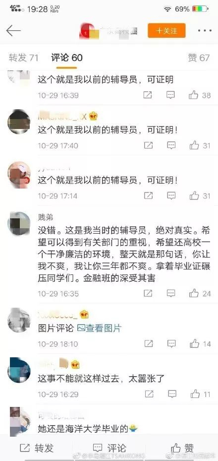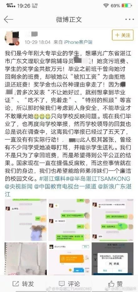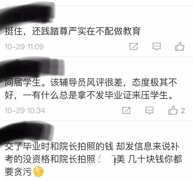 29日有广东文理职业学院毕业生在微博举报该校一名辅导员“贪污”班费及学生奖助学金数万元,并多次表示“不让我好过,就别想要毕业证”“你要在校门外,我今天打死你”。